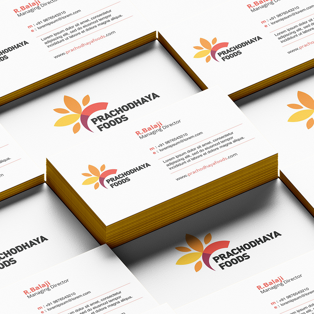Using yellow and red to create an attractive logo and professional stationery designs. The client was delighted with the distinctive brand identity, making Prachodhya Foods easily recognizable and appealing to customers, thanks to Kaalya’s creative solutions.